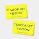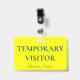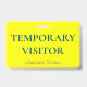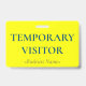 This basic badge design features the message "TEMPORARY VISITOR", and a customizable company name or other custom message. A badge like this could be used to identify that somebody at a workplace or business is an authorized guest/visitor. [~Z0000307]
