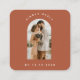 Modern, trendy RSVP enclosure cards, featuring custom arch shaped photo, terracotta background, text & QR code. Easily add your details by clicking on the "personalize this template" option.