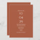 A modern minimalist design featuring your special date and wedding details set in classic, chic typography on a terracotta background. With all your special wedding day information on the reverse, including your RSVP, accommodation, and additional details. Designed by Thisisnotme©