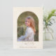 Elegant, clean minimalist style holiday design featuring arch-shaped photo template with thin gold gradient border with editable text fields on a watercolor paper style eggshell background.