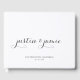 A pretty script charcoal black typography on white, personalized wedding guest book, with a trendy unique contemporary typography for the modern minimalist. Wedding guest signing keepsake book to greet your guests at the wedding reception, or a bridal shower, or engagement party, to be your keepsake forever. If you would like to change the colours of fonts or font style, after personalizing simply click on "edit further", select your type and see the colour palette on the right, and the font choices.