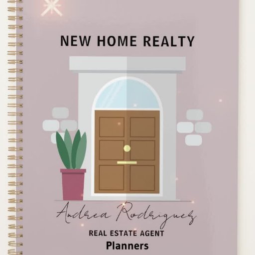 This elegant and modern notebook design is perfect for real estate professionals. The minimalist graphic style features a stylized front door with an arched window, flanked by wall sconces and a potted plant. The bold text above the door adds a professional touch, while the customizable area below allows you to personalize it with your name and title. The soft pastel pink background exudes warmth and welcome, making it an ideal companion for note-taking on-the-go.