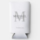 This can cooler features personalized groomsman's name with title and wedding date in grey and monogram in light grey as background, in classic serif font style, on white background.