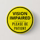 This bold button features the slogan 'Vision Impaired, please be patient' in a black font. You can edit the text as needed. The background is neon yellow to grab people's attention. 🟡 For more blindness pins, visit my store: Zazzle.com/Elder_Vitality 🟡 For custom orders, message me on Zazzle