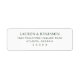 Cette étiquette d'adresse de retour présente un design épuré et minimaliste avec un texte centré sur fond blanc. La police serif classique ajoute une touche d'élégance, tandis que la palette de couleurs noir et blanc crée un look intemporel. Parfaite pour les occasions formelles, cette étiquette offre des champs personnalisables pour les noms et les adresses, assurant une apparence personnalisée et sophistiquée. Sa composition simple met l'accent sur la clarté et la finesse, ce qui la rend idéale pour les mariages ou autres événements spéciaux.