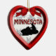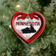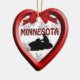 A graphic design of snowflakes and a snowmobile in a 3D style red frame on a heart shape Minnesota Christmas ornament. The ornament has text templates for your personalization. ©2012charmainepaulson