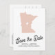Modern MINNESOTA State Destination wedding save the date with MINNESOTA State silhouette in blush pink with with heart, save the date in a contemporary font and your name and wedding date along the bottom. On the back a space for a custom message and your return address.