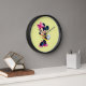 The size of the clock is dramatic and the abstract alcohol ink design is soothing and intricate at the same time. I chose the black frame that adds pop to the blue and gold design. The gold printing would be better in a slightly darker or larger font. I love it and I’m looking for just the right place in ny new apartment. I would recommend this clock for a personal gift or a present. I feel that the quality is excellent for the money! I’m a bit of a clock nut so I’m pretty particular about my purchases. The clock is larger in diameter than many if the clocks I have, so it stands out very well. I think a slightly darker printing color and a moderately larger size would best suit a professional decor or add more impact in a work place item.