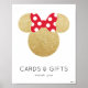 Welcome your guests in style with this charming Minnie Mouse "Cards and Gifts" table sign! Featuring the iconic Minnie Mouse head adorned with shimmering gold glitter sparkles and a delightful redand white bow, this sign adds a touch of magic to your celebration. Perfect for weddings, bridal showers and bachelorette parties, it helps guide your guests to the designated area for cards and gifts with elegance and whimsy.
