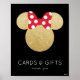 Welcome your guests in style with this charming Minnie Mouse "Cards and Gifts" table sign! Featuring the iconic Minnie Mouse head adorned with shimmering gold glitter sparkles and a delightful redand white bow, this sign adds a touch of magic to your celebration. Perfect for weddings, bridal showers and bachelorette parties, it helps guide your guests to the designated area for cards and gifts with elegance and whimsy.