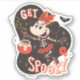 This bold and playful illustration features Minnie Mouse in a spirited Halloween theme. Dressed as a skeleton with a festive witch's hat, Minnie is joyfully stirring a bubbling cauldron under a starry night. The words "Get Spooky" set the tone, while bats and a floating skull add to the eerie yet charming atmosphere. The design uses a striking contrast of black and red on an orange background, capturing the essence of a fun and spooky Halloween.