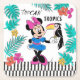 This cute summer graphic features Minnie Mouse holding a toucan among tropical flowers and stripes.