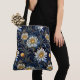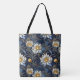 Featuring a stunning pattern of celestial white blooms against a deep, midnight blue background. The golden accents on the delicate petals and graceful stems glimmer like starlight, transforming a simple accessory into a statement piece. It’s perfect for carrying your daily essentials, whether you're heading to the market, a yoga class, or a coffee date with friends. With its durable construction and timeless design, this bag is a testament to the fact that true elegance never goes out of style.