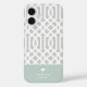 Stylish custom phone case in grey, mint and white colours. This design features a preppy Moroccan trellis pattern. Personalize it with your name monogram or other custom text with a cute heart symbol. Use the design tools to choose any background colours, edit the text fonts and colours and upload your own photos to create a unique one of a kind device cover!