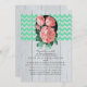 Rustic chic wedding invitation with mint and pink design: mint chevron lines (zigzags) and coral roses. Created on the distressed white wood background texture. Perfect invite for country chic barn weddings.