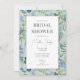 Elegant bridal shower invitation features mint background with blue hydrangeas, yellow flowers and greenery.