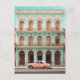 Classic picture from a typical street scene. A salmon peach old vintage car parked in front of a mint coloured colonial building in Havana Cuba