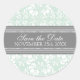 Save the Date envelope seals for wedding, in elegant light pastel mint green, grey and white classic floral damask pattern, the perfect addition to your save the date card envelopes, available in many matching wedding products. Contact us for a colour change request.