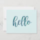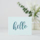 Pretty and elegant flat note cards with a simple watercolor hello typography design in a teal blue design on a mint green / aqua blue background. Use the back to write quick notes to family and friends.