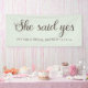Mint green bridal shower banner with text in a cute, cursive script font, "She said yes." Personalized with the name of the bride-to-be and her shower date.