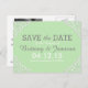 This elegant Save the Date postcard features a mint green background with an intricate damask design running along the border. If you prefer a coloured background, just click the blue 'Customize It' button and select any colour of your choice.