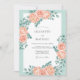 This design features a soft palette of peach and mint green, ideal for a romantic spring event. Delicate watercolor roses in shades of coral and apricot are paired with lush silver dollar eucalyptus foliage. The artwork creates a serene botanical aesthetic against a clean white backdrop.