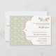 Elegant and beautiful french Moroccan tile inspired wedding response cards with a repeating light, pale mint green jade hue and gold geometric pattern design and gold hued floral flourishes. This upscale and luxe RSVP card is perfect for a Moroccan, Arabian Nights or Aladdin themed wedding. The back of these custom, fancy frame cards can be personalized with the names of the bride and groom on the printed ribbon look design. Artwork and design © Chrissy H. Studios, LLC. All Rights Reserved.
