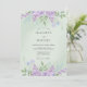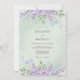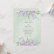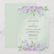 This design features a soft mint green backdrop adorned with delicate watercolor lilacs and petite blue blossoms. The ethereal aesthetic creates a serene atmosphere perfect for a romantic spring event. Verdant leaves and stems add a botanical touch to the upper and lower borders, highlighting the centre with natural beauty.