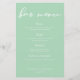 This soft mint green wedding bar menu features chic white typography for a sweet spring outdoor ceremony. Simple and elegant script on tranquil solid pastel green menus for a garden reception.