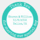 Mint green and white wedding favour stickers, with custom text going around the outer edge and in the middle. Personalize all the text fields for your wedding.