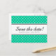 Simple save the date postcards with mint green and white polka dots pattern. Modern chic polkadot print design for elegant wedding party. Trendy and fun contemporary style. Custom background colour shade and personalized template text on the back. Change the quantity to get the cheapest price per card.
