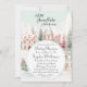 A charming baby shower invitation with a mint and pink watercolor Fairytale Winter scene with cozy homes, Christmas trees and snow in awaitance of a little snowflake! You can personalize this invitation with your own details.