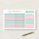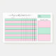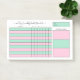 Weekly habit tracker post-its with charts in mint green and cool pink. Add your name in a thin script. The habit tracker notepad features a handy chart where you can check off each day of the week with up to ten habits. Add the time period by hand. And jot down three weekly goals too! All categories are customizable in case you want to change the wording or even the purpose of the planner.