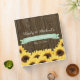 A SUNFLOWER THEMED WEDDING ORGANIZER PLANNER BINDER WITH A COUNTRY CHARM AND A RUSTIC FEEL. A WOOD GRAIN WOODEN FENCE OR BARREL LOOK DESIGN AND A NAIL HEAD TRIM. WRITE WHATEVER YOU WANT ON THE MINT LIGHT GREEN JADE PRINTED RIBBON BANNER AND ADD THE INITIALS OF THE BRIDE AND GROOM INSIDE THE CARVED HEART DESIGN ON THE BACK OF THE ALBUM. A BOUQUET OF GOLDEN YELLOW SUNFLOWERS HAVE A VINTAGE AND PAINTERLY LOOK. PERFECT FOR A COUPLES WEDDING SHOWER, ANNIVERSARY OR BRIDAL SHOWER WITH A BARNYARD BARN FARM OR FARMHOUSE THEME. DESIGN © CHRISSY H. STUDIOS, LLC. ALL RIGHTS RESERVED.