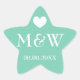 Mint green and white sea star fish monogram wedding favour stickers. Cute heart with monogrammed name initials of bride and groom plus date of marriage. Personalized thank you stickers or fancy envelope sealers / seals. Elegant stylish typography for bride and groom name initials. Cute maritime design. Customizable background colour. Romantic love icon. Starfish shaped labels for coastal / seaside beach theme wedding.