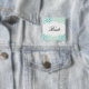This square bride button features a vintage look with a faded mint green and teal blue background and a light damask overlay. A white swirly frame with a light grey border features customizable text.