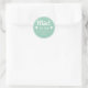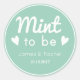A simple design for a sticker to decorate a wedding favour. The sticker is a pale mint green with a white border, white love hearts and white text saying "Mint to be" with space for your names and your wedding date below.