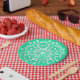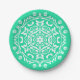 This white mandala sits on a minty green background. The colours are very relaxing and light. Part of the Mola Mandala Collection.