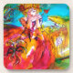 Colourful, whimsical and vibrant Venetian masquerade character. Beautiful sophisticated blonde woman is sitting with a red rose and a feathered mask in hand with sparkling gold fuchsia fabrics of a baroque masked ball costume with feathers and a dog. Watercolor painting with bright colours in ,yellow blue pink, green,gold sparkles and silver foil , inspired from characters of Comedy of Art ( Commedia dell' Arte ) , Carnival of Venice and Venetian feather masks.This cool and artistic design is also a beautiful gift for special occasions ,birthdays ,christmas, holiday,Valentine's Day,Mardi Gras ( Fat Tuesday ) season.