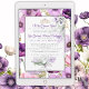 Moderna invitación Mis Quince Años Quinceañera con amapolas blancas y lilas y una hermosa tiara dorada