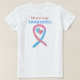 Miscarriage awareness uses a pink and blue ribbon for its cause awareness. The shirt art features a blue and pink awareness ribbon heart art painting. The awareness t-shirt message notes "Miscarriage Awareness". There is a large image on the back of the shirt and a smaller picture on the front of the shirt. The NIH explains pregnancy loss as "when a pregnancy ends unexpectedly before the 20th week. It is sometimes called early pregnancy loss, mid-trimester pregnancy loss, miscarriage, spontaneous abortion, or fetal demise." The NIH states "stillbirth refers to the death of a fetus at or after the 20th week of pregnancy."