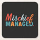 A playful and colourful design featuring the text "Mischief Managed" in a bold, playful font. The text is rendered in a vibrant, multi-colour palette, evoking a sense of fun and mischief.