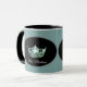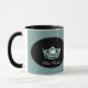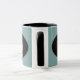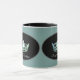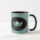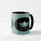 This two-tone mug has a black handle and black interior. Dusty Aqua background over white mug features ovals on each side with an aqua green pageant crown in the centre of the ovals bordered by grey. Personalized text underneath each crown for you to customize. Text sample shown in "Miss Montana".