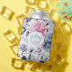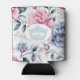 Can cozy with white background, soft floral peony print of pink, blue and grey, and an iconic American pageant crown in soft light blue in centre. images on front and back. personalize this item or buy as shown.