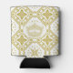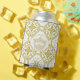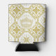 Can cozy with off white background, a gold-coloured coronation print and an iconic American pageant crown in gold-colour in centre. images on front and back. personalize this item or buy as shown.
