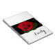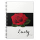 Notebook shown with a photo print of a Red Rose print on a black background and a personalized name. Notebook shown in White, but choose your colour of background. Customize this item and change the name to yours or take off, or purchase as shown.