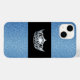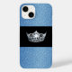 This phone case is shown in the iphone 14 case and is shown with a faux glitter print in Blue with a Silver crown on a Black accent strip.