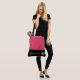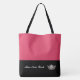 This cute stylish large tote bag is shown in a Geranium Pink and Black colour block style with a pageant crown and custom text.