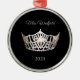 Christmas ornament shown in a round shape with a pretty silver colour crown, with fancy script text in Silver-Grey and Black colour background. Shown with red ribbon and silver rimmed. Customize this item with your personal pageant name, date or other. Sample name shown is "Miss Westfield".