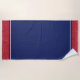 This beach towel is shown in a Navy Blue towel with ends in Red faux glitter colour and a coordinating solid stripe.